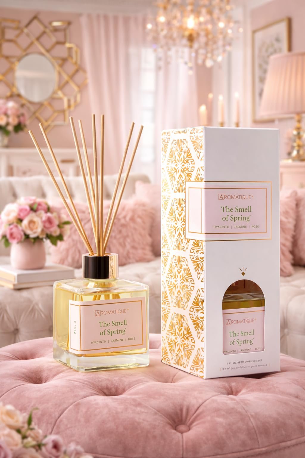 Aromatique, Smell of Spring, Reed Diffuser Set, 5 oz, reusable, refillable includes 8 reed sticks, Flame Free, Home Decor Fragance Notes Jasmine, Rose and Hyacinth.The Aromatique Reed Diffuser Set in Pumpkin Spice delivers a steady, long-lasting aroma that infuses your space with a rich blend of scents. Experience months of consistent fragrance, featuring notes of candied pumpkin, vanilla, and cherry, balanced with maple and cinnamon. This diffuser provides a constant, hassle-free way to enhance your surroundings with appealing aromas.This reed diffuser set doubles as a decorative piece, thanks to its textured glass bottle and sleek 8” reeds. The design integrates seamlessly with various home styles, from contemporary to classic. Its aesthetic appeal makes it a functional addition to any room, enhancing both scent and visual interest.The diffuser features a unique combination of pumpkin, clove, and nutmeg, creating a distinctive and engaging aroma. The blend of warm spices and sweet cherry adds depth and character to the scent, making it a standout choice for enhancing any space, from living areas to office settings.The high-quality diffuser oil ensures that you get enduring freshness without the need for frequent refills. This offers a practical solution for maintaining a pleasant aroma in your home.The Reed Diffuser Set makes an excellent gift choice for various occasions. Its elegant design and complex scent profile make it suitable for housewarmings, birthdays, or other celebrations. Whether for a friend or yourself, it’s a refined gift that combines both style and function.Boxed and ready for gifting for Valentine's Day, Mother's Day, Bridal Showers, Anniversary gift, etc.