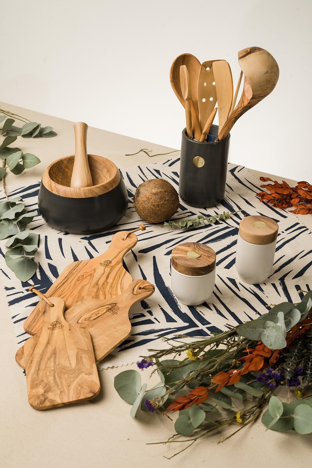 Handcrafted from dense, richly grained olive wood, each piece is unique, offering a smooth waxed finish that enhances its natural beauty. Renowned for its durability, olive wood resists scratches, odors, and stains — ensuring a lifetime of use in a healthy, authentic kitchen.