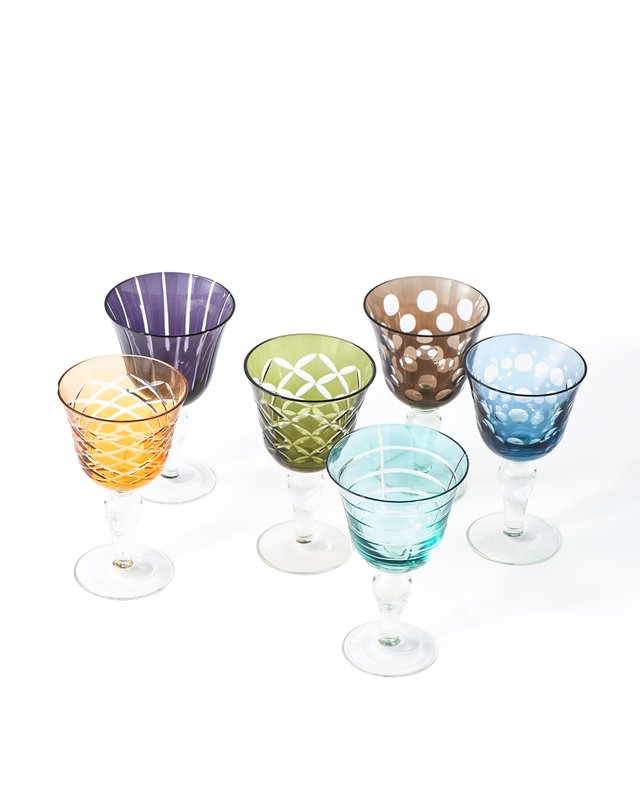 • Set: 6 wine glasses—each with a different color & pattern