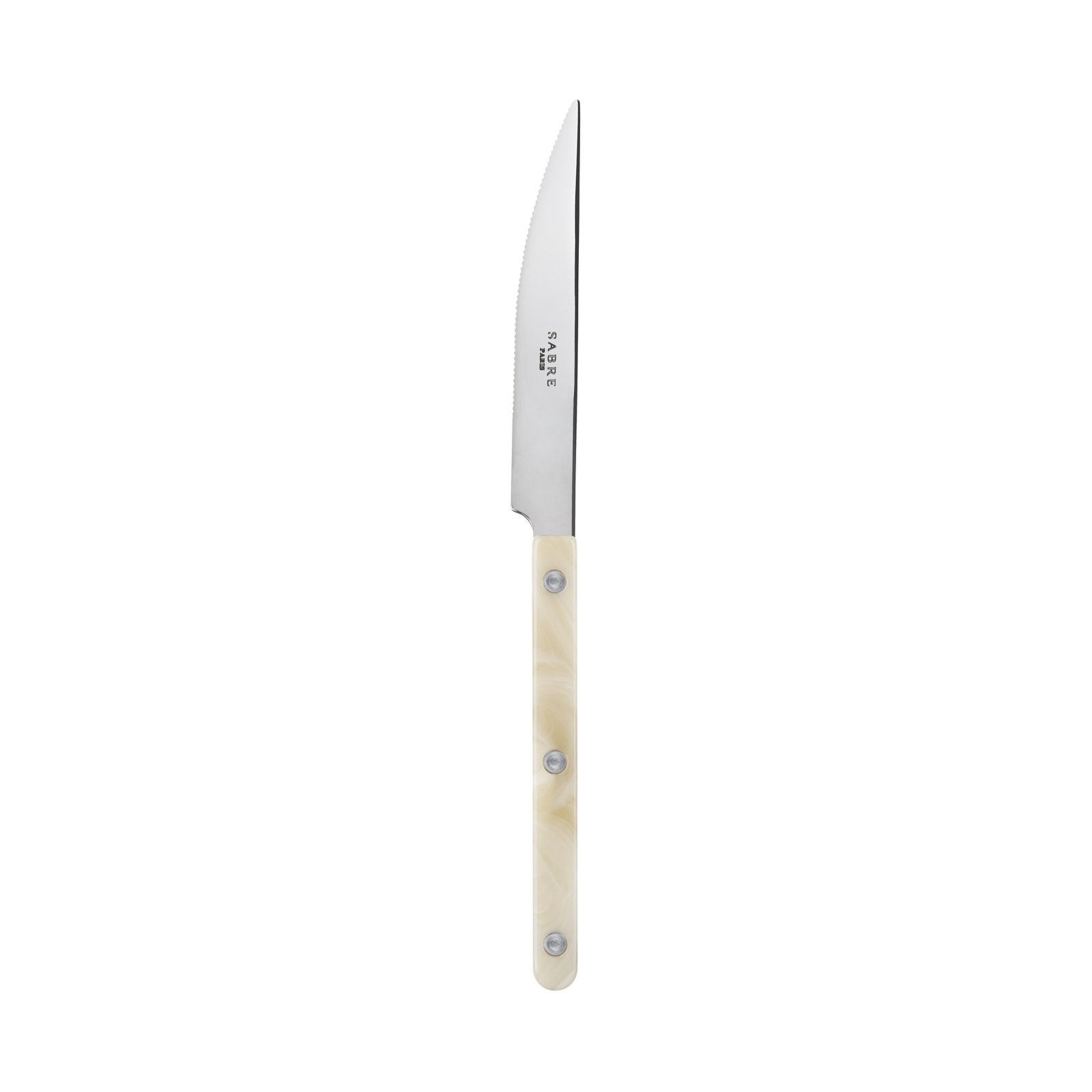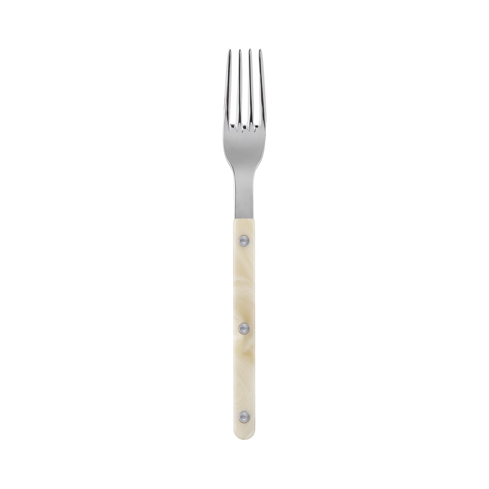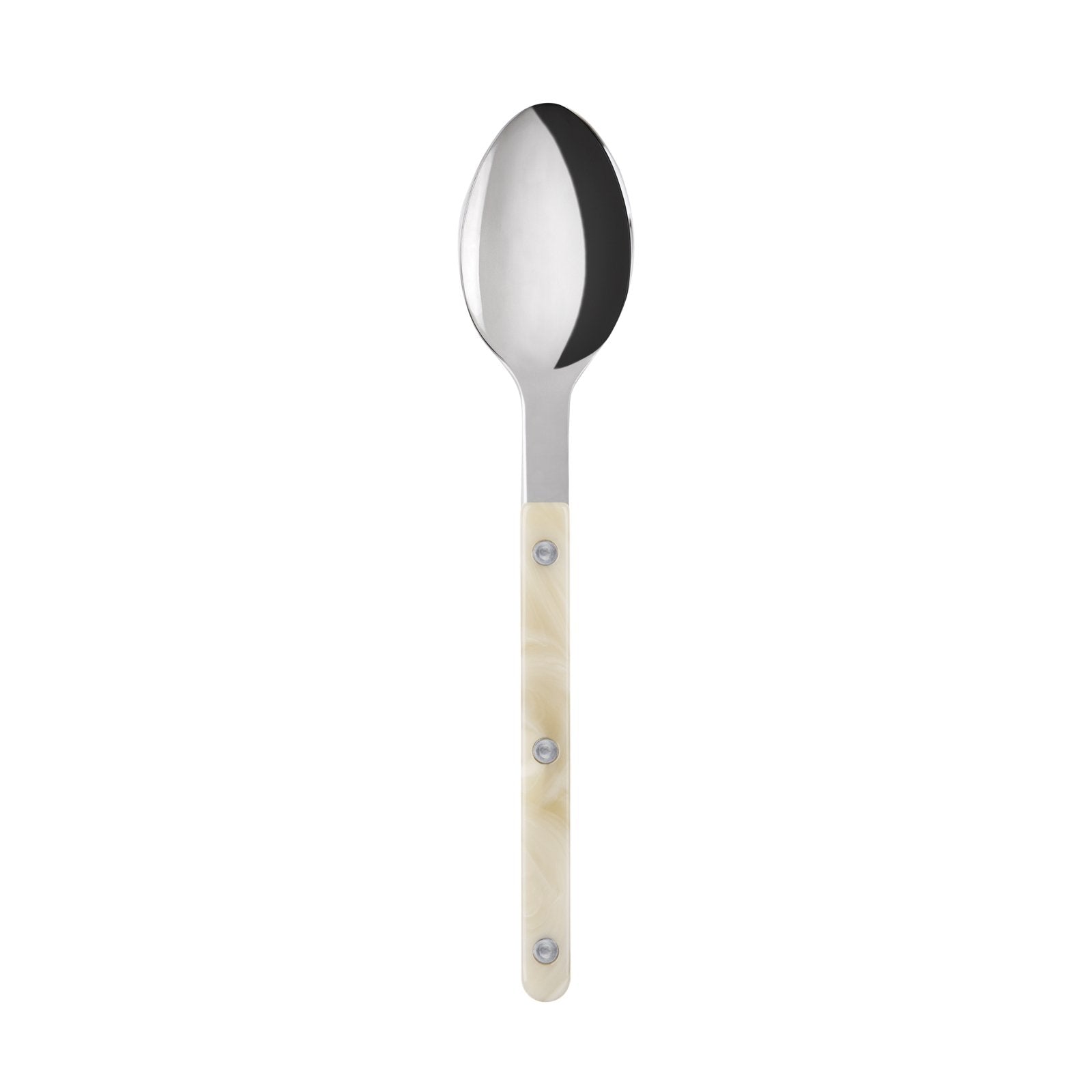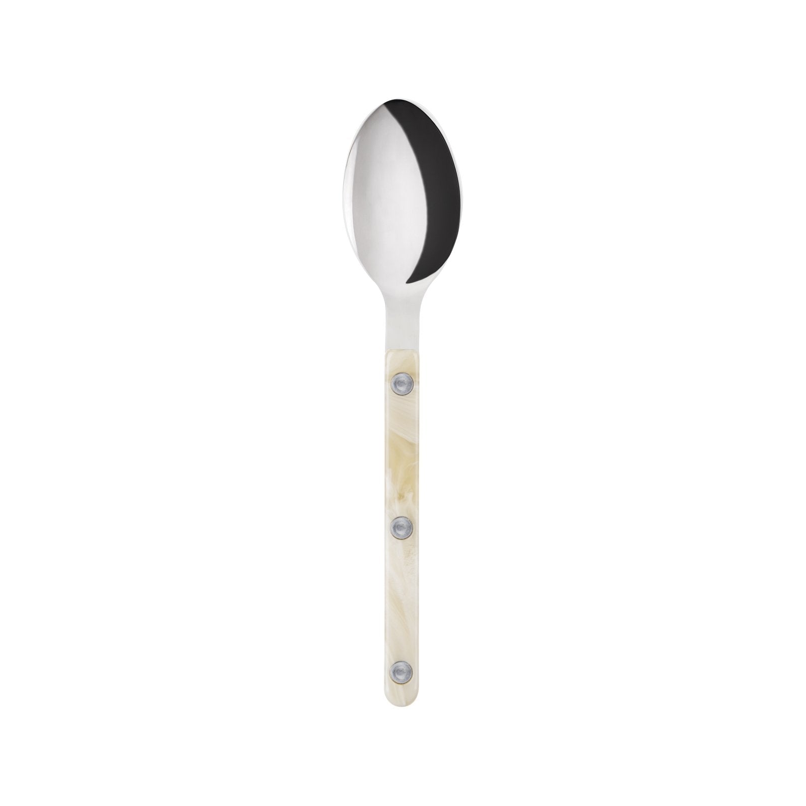 The Bistrot collection features three rivets in the handle design and a unique pattern with swirling, high contrast variegation - reminiscent of marble or granite. Flatware is crafted using heavy weight 18/10 stainless steel.