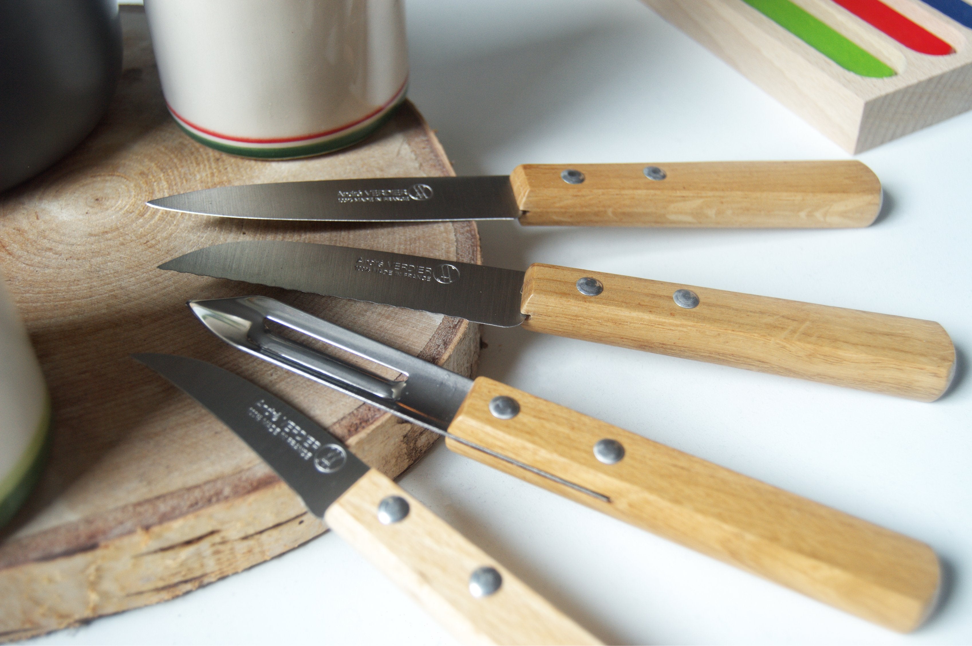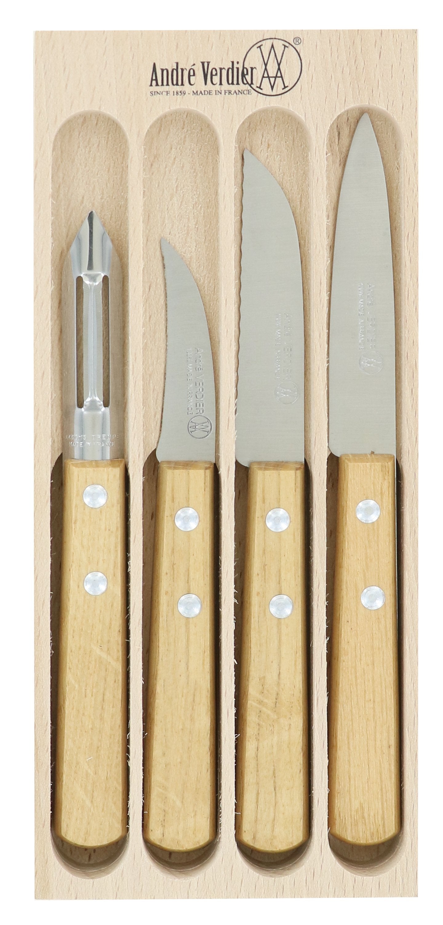 Andre Verdier Prepa Culi 4 Piece Knife Set | Peeler, Peeling Knife, Serrated Peeling Knife, Paring Knife | Varnished Oak Handle