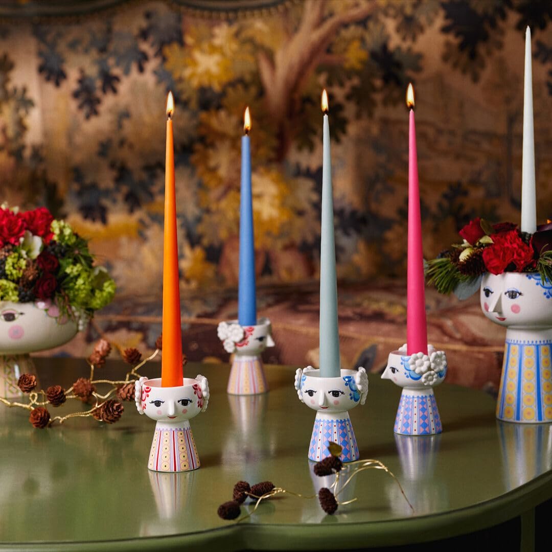 At 3.7" tall she fits anywhere and elevates everything around her. Light a tealight or taper candle inside and the glazed porcelain glows warmly, bringing her cheerful expression to life. Leave her unlit and she still earns her place as a sculptural ornament on a shelf, table, or windowsill.