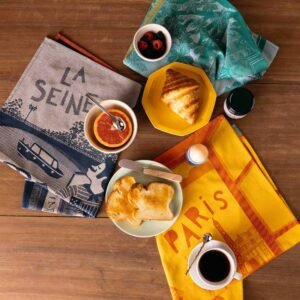 Add a touch of French elegance to your home with Moutet linens — the perfect hostess or housewarming gift. Use these beautiful kitchen tea towels to wrap a bottle of wine, a favorite book, or a candle for a unique and eco-friendly gift presentation. The tea towel "La Seine" , designed by Hélène Druvert , sketches a poetic stroll along the quays, where the unique atmosphere of the capital emerges. It features the emblematic decor of Paris: a bookseller , an accordionist , a bicycle placed at the water's edge , not forgetting the bateau-mouche which glides gently under the bridges.