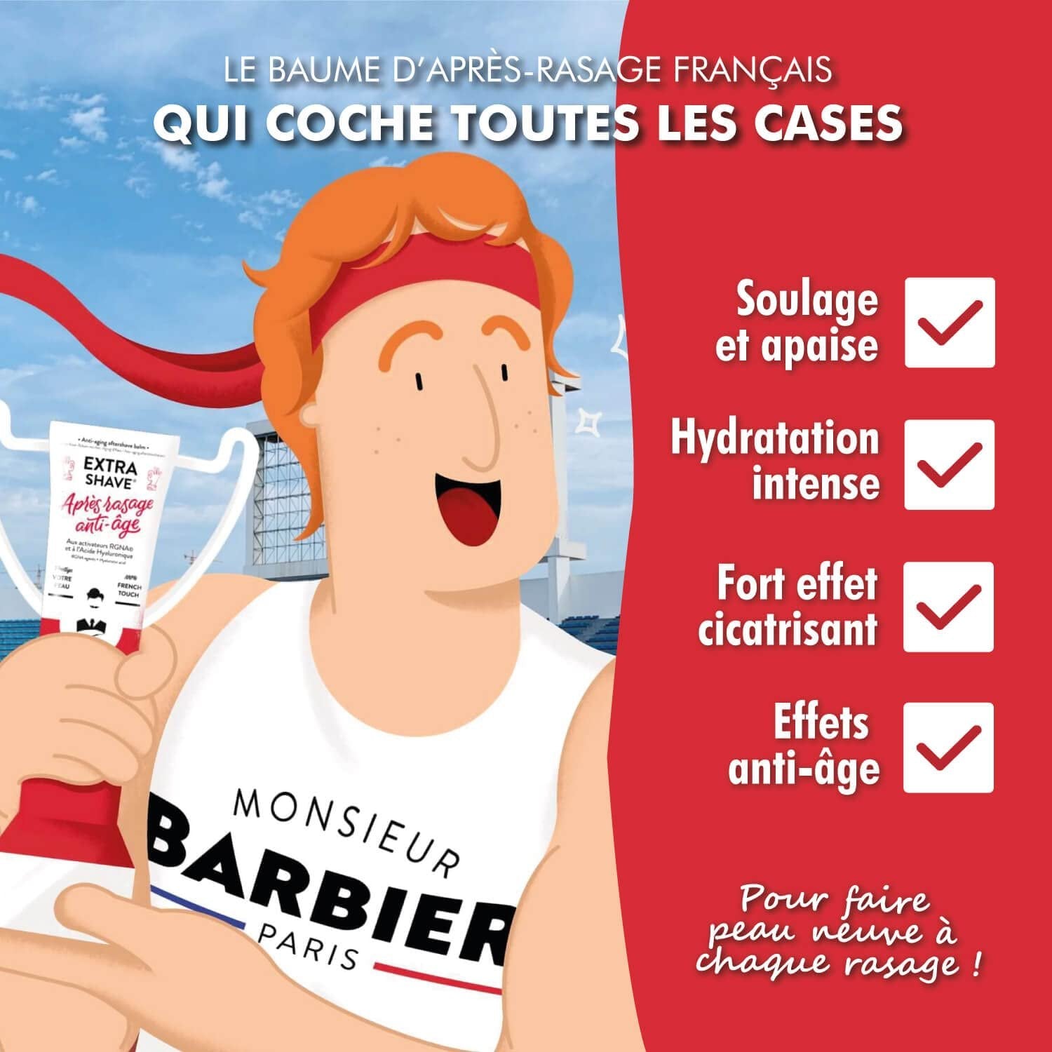 Did you know that when you shave, the blades remove hair and dead skin? This natural peeling action cleanses and revitalizes the epidermis, but it can also be irritating. That's why Monsieur BARBIER has developed an aftershave with a triple soothing action that amplifies the rejuvenating benefits of shaving.
