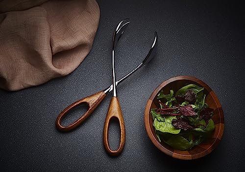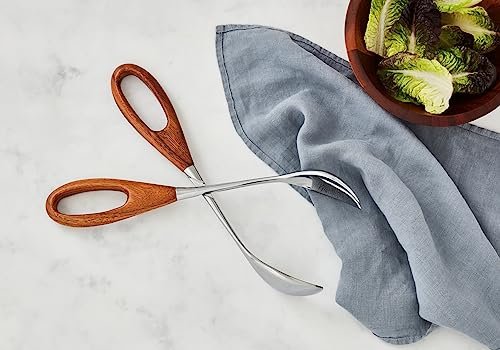 Nambe Curvo Salad Servers Scissors Tongs | Made of Stainless Steel and Acacia Wood