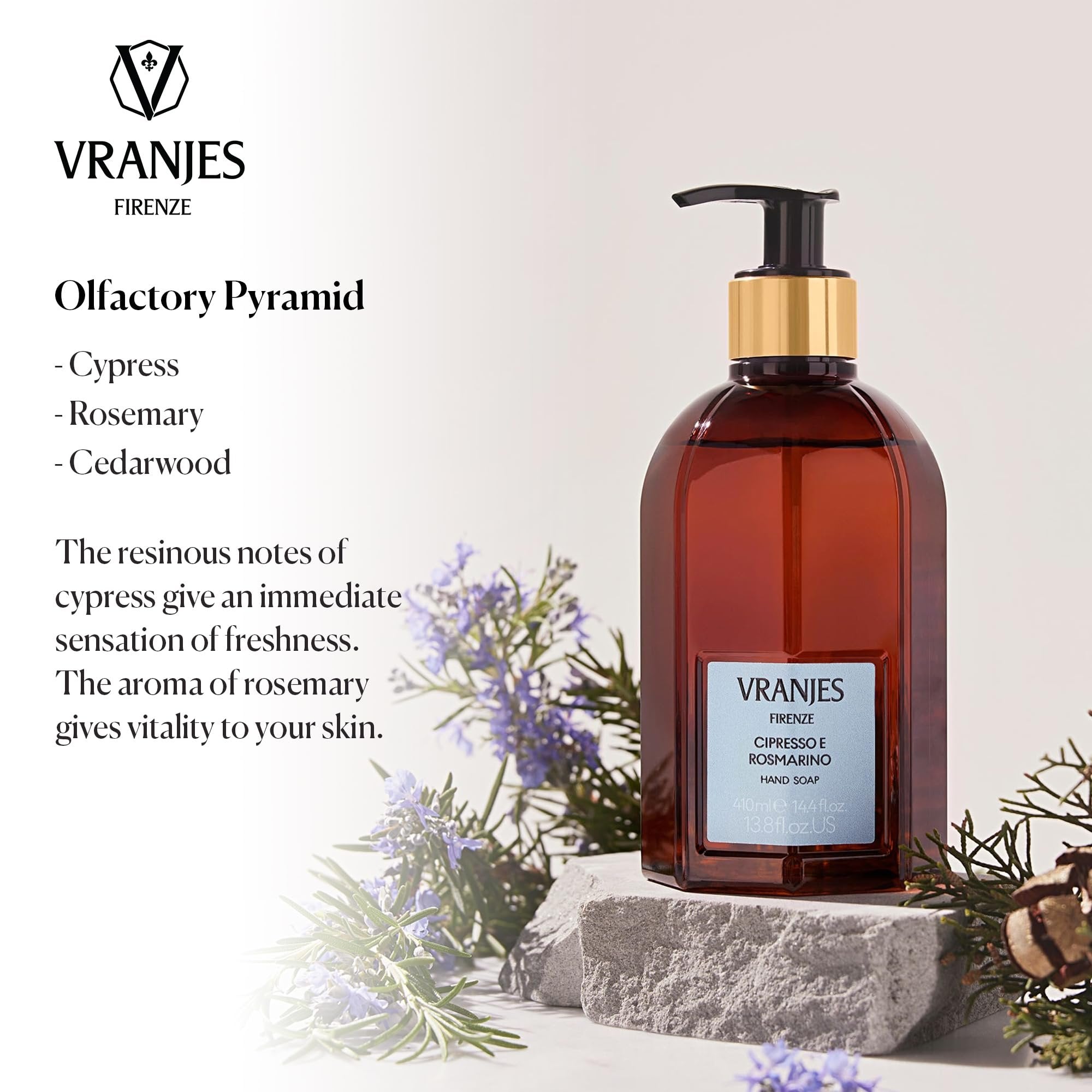 Discover the refined elegance of Dr. Vranjes Firenze Cipresso e Rosmarino Luxury Hand Soap, a moisturizing liquid hand wash crafted in Florence, Italy. This premium hand soap features the aromatic freshness of Tuscan rosemary blended with the crisp, woody depth of cypress for a naturally invigorating and elegant fragrance.