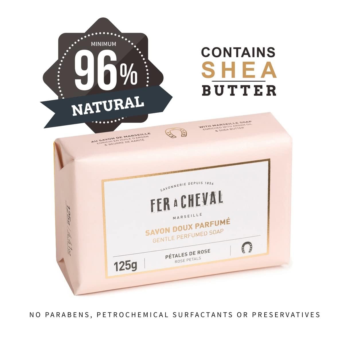 This Marseille gentle perfumed soap bar with Rose Petals scent has been specially developed to be the softest and least allergenic for the skin. A formulation composed of 96% of ingredients of natural origin, which does not contain surfactants and petrochemical preservatives, mineral oils or synthetic dyes. By blending argan and shea butter oils with vegetable Marseille soap, a gentle soap is created that is widely recognized for its ability to deliver a comforting and gentle experience to the skin, without any risk of irritation. Our Marseille gentle perfumed soap bar, scented with Rose Petals, blends the calming benefits of argan oil with the richness and creaminess of coconut oil to create a luxuriant lather.