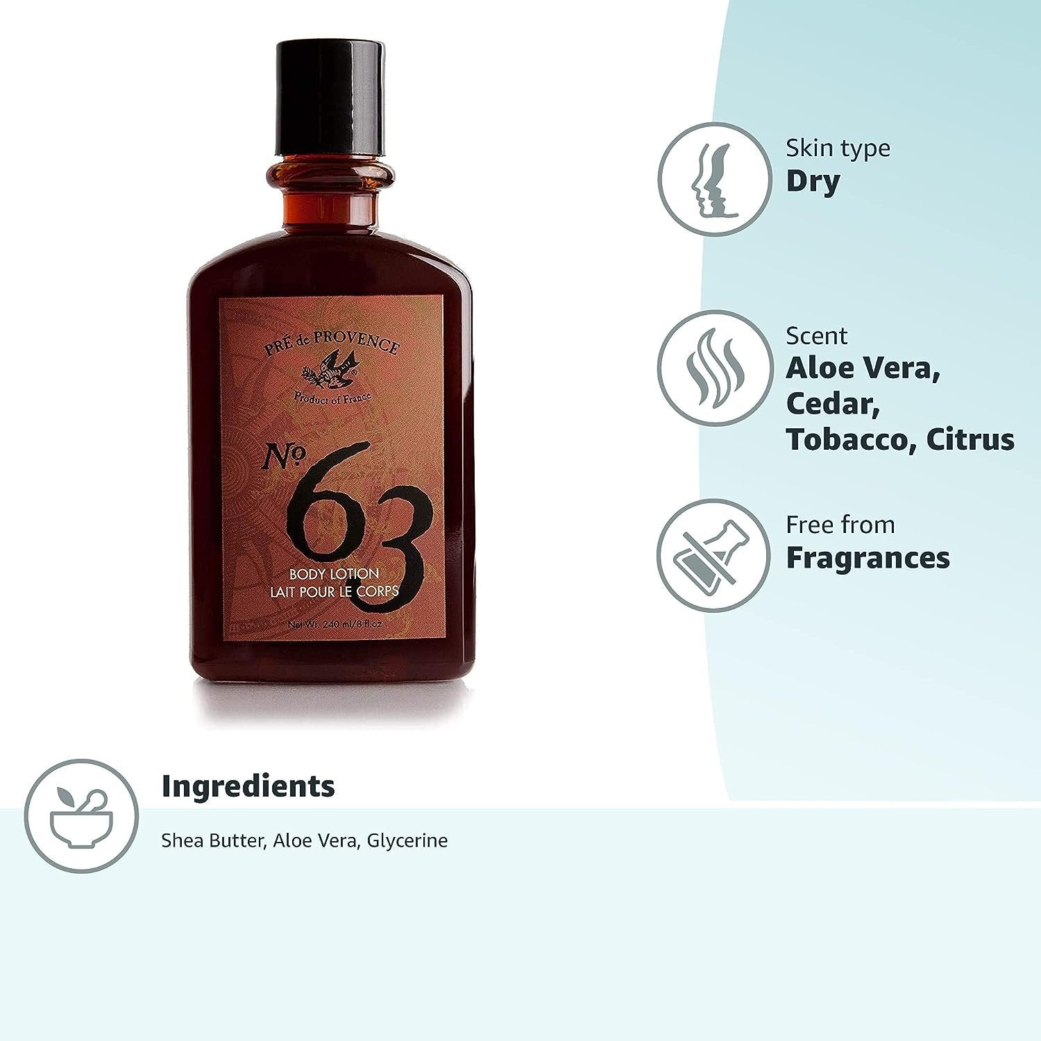 Features Lightweight, non-greasy formula Enriched with shea oil, glycerin, and aloe vera Hydrates and softens dry or rough skin Warm, aromatic scent with notes of citrus, cedarwood & amber Made in France | Part of the No.63 Men’s Collection