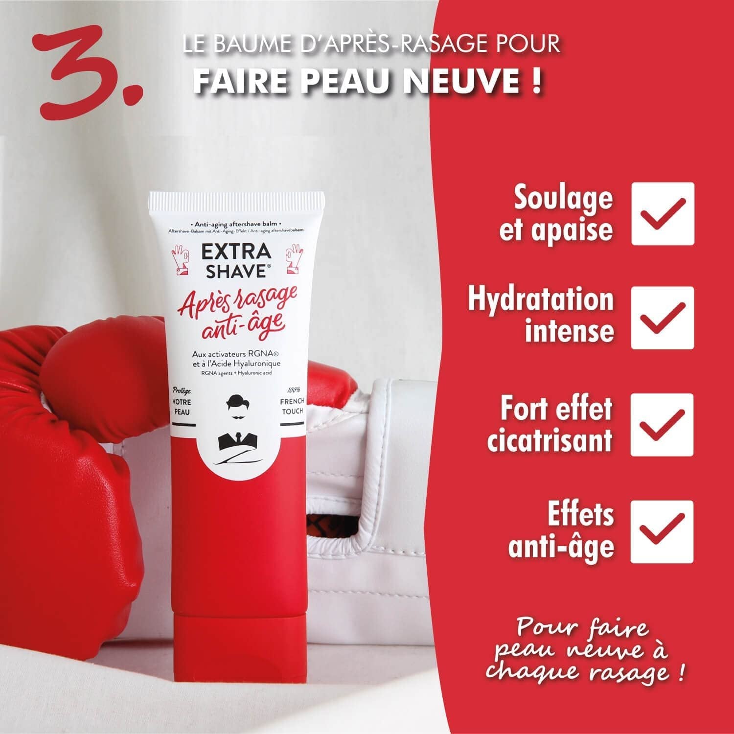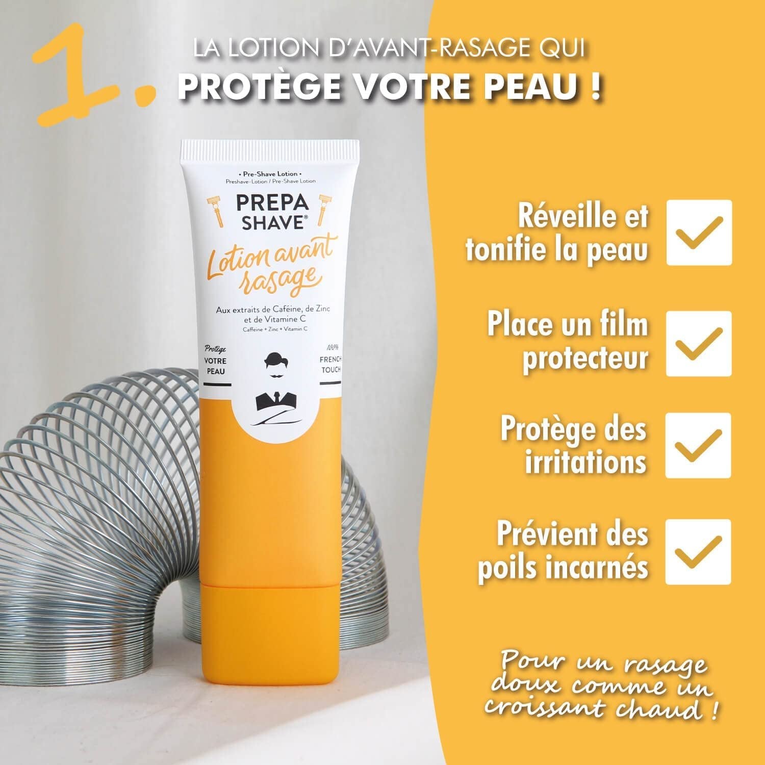 Apply a few drops of the Prepa-Shave lotion before your shave to activate the super-protection against irritations. Then, lather the Better-Shave shaving cream on your skin (with or without a shaving brush). Moisturize and regenerate your skin with a knob of Extra-Shave. Your skin will thank you, very much.