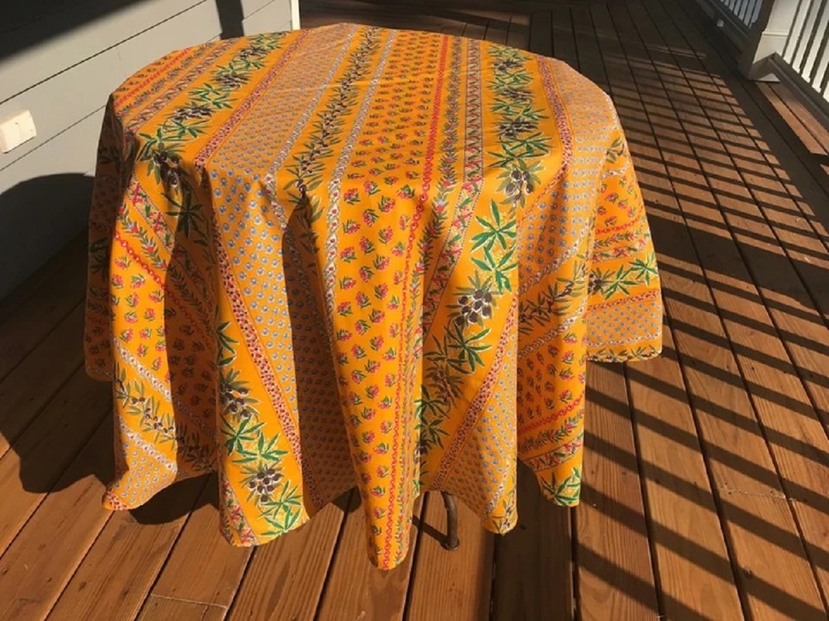 Olives & Mimosas Yellow Provencal Tablecloth | 70" Round | Easy Care Coated Cotton