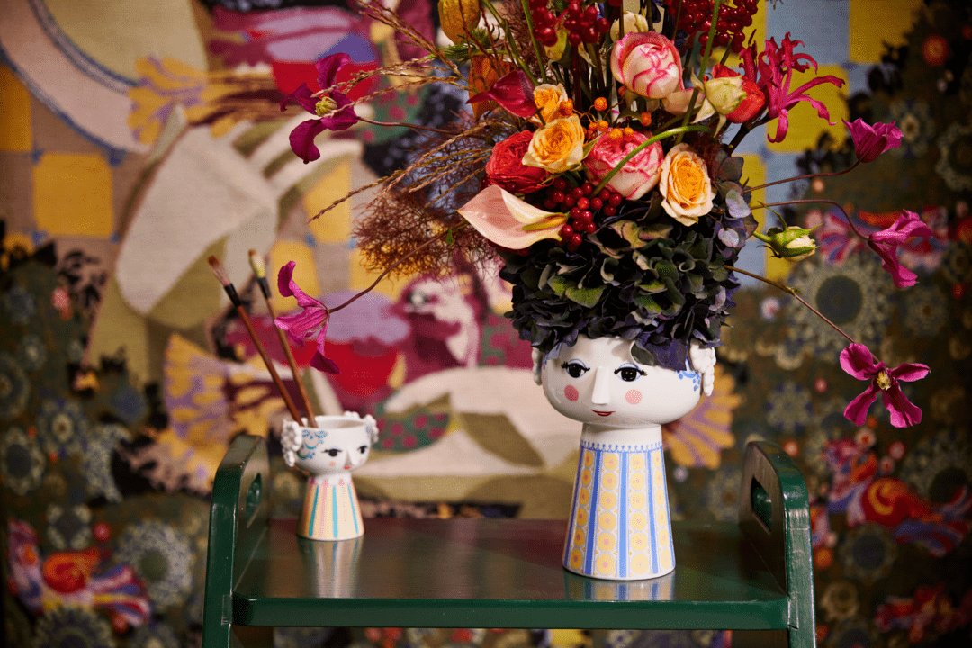 Adorned with flamboyant blue patterns and the iconic Eva face, this decorative vase brings personality and charm to any room. Its sculptural silhouette makes it ideal for displaying fresh flowers, seasonal stems, flatware on a buffet, or even standing alone as a striking art piece. Wherever it is placed, Eva spreads joy and color—just as Bjørn Wiinblad intended.