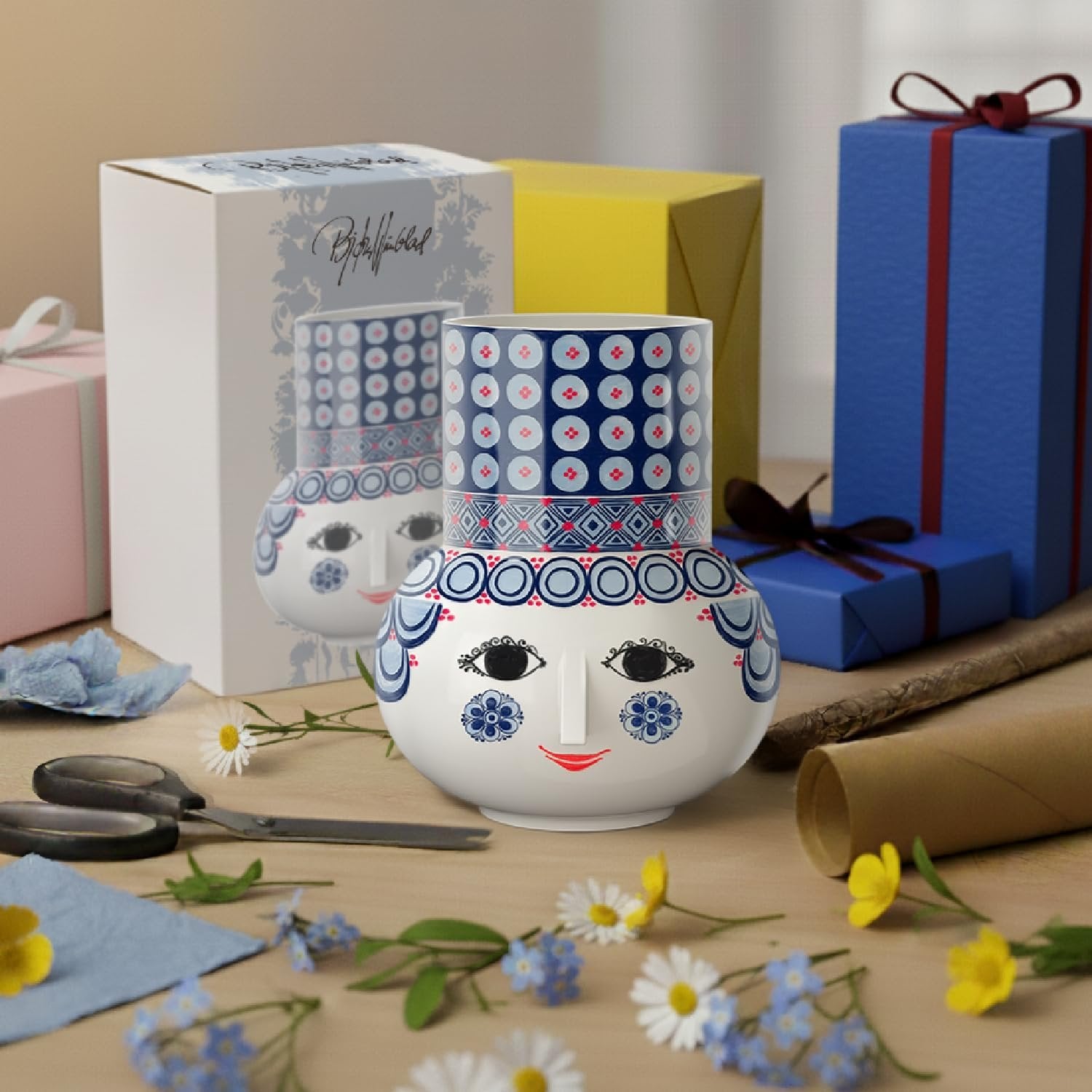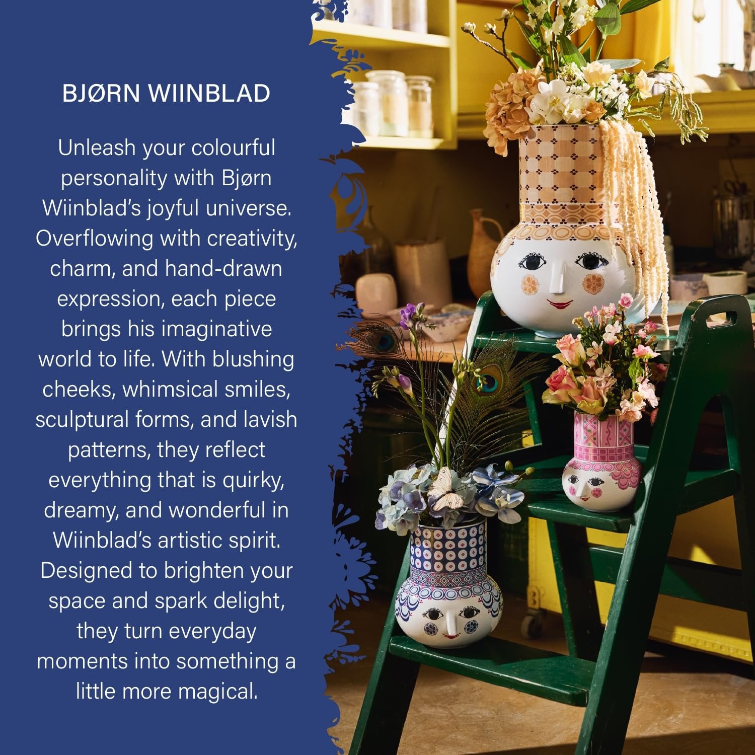 Add bold color and playful Danish design to your home with Bjørn Wiinblad’s Olga vase. With her cheerful smile, rosy cheeks, and expressive decorations, Olga captures the whimsical spirit of Bjørn Wiinblad—joyful, artistic, and unmistakably one of a kind.